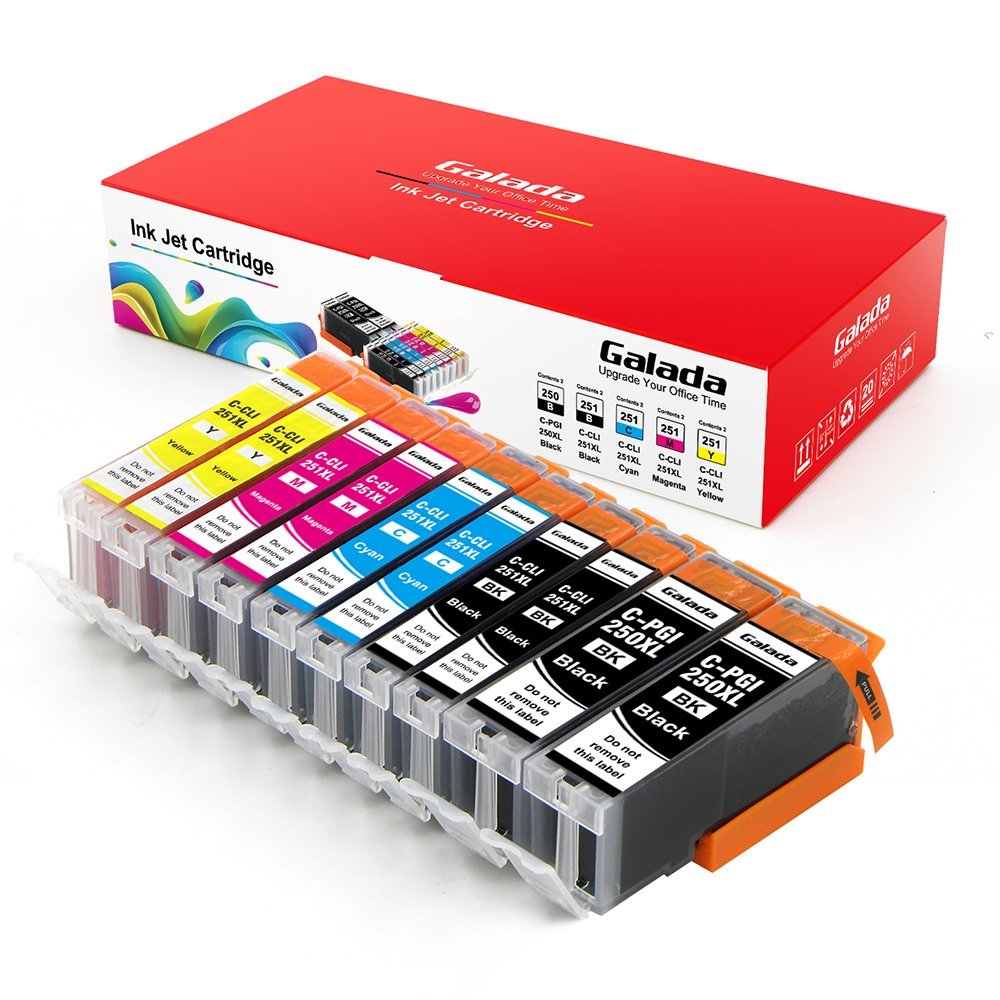 - Includes 2 PGI-250XL Large Black, 2 CLI-251XL Small Black , 2 CLI-251XL Cyan , 2 CLI-251XL Magenta , 2 CLI-251XL Yellow Galada ink cartridges ( Total 10 Pack )
