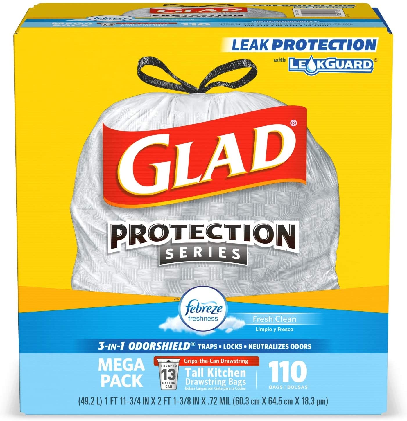 - 13 GALLON PLASTIC TRASH BAGS: Glad Tall Kitchen Drawstring Trash Bags with stretchable strength, traps, locks and neutralizes odors to keep your kitchen smelling fresh with a Fresh Clean scent; Package may vary