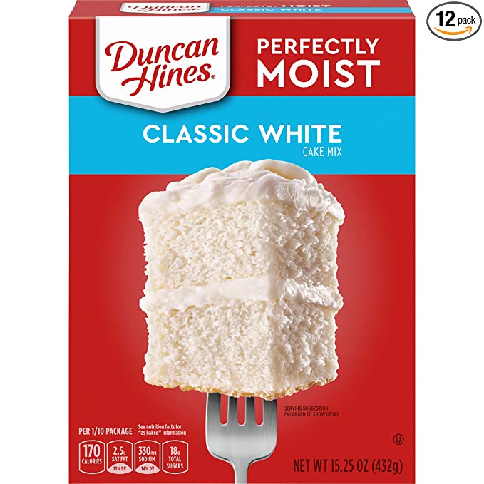 - Twelve pack of 15.25 oz boxes of Duncan Hines Perfectly Moist Classic White Cake Mix