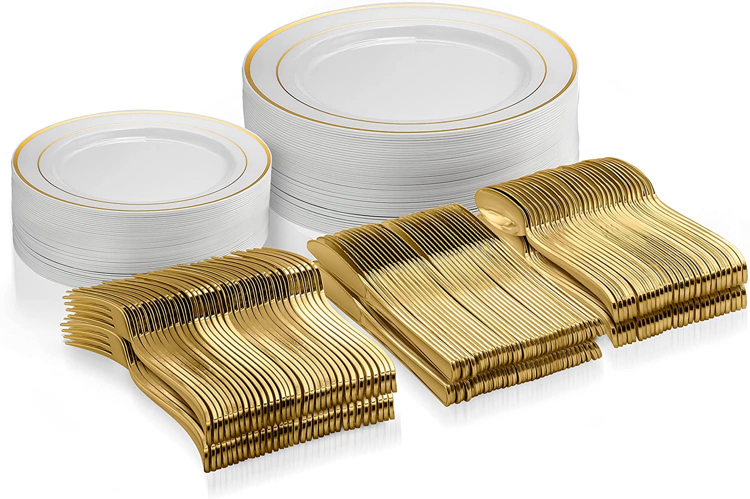 - Premium quality decorative gold rim disposable dinnerware set made to save your time and energy, just toss the dinnerware when you’re done, no clean-up necessary