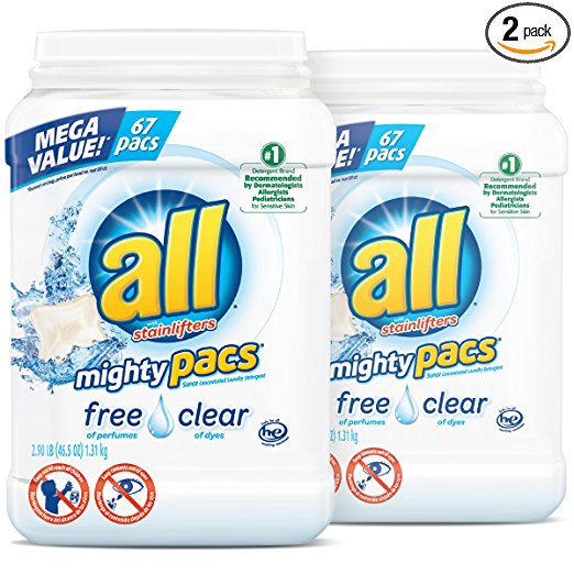 all Mighty Pacs Laundry Detergent, Free Clear for Sensitive Skin, 67 Count, 2 Tubs, 134 Total Loads – Link