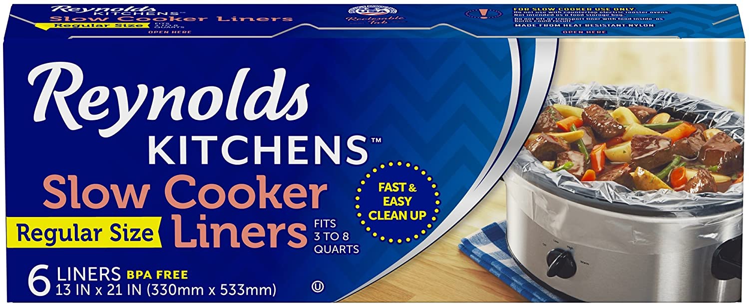 - This package contains six Reynolds Kitchens Slow Cooker Liners, each measuring 13 x 21 inches to fit 3 to 8-quart round or oval slow cookers