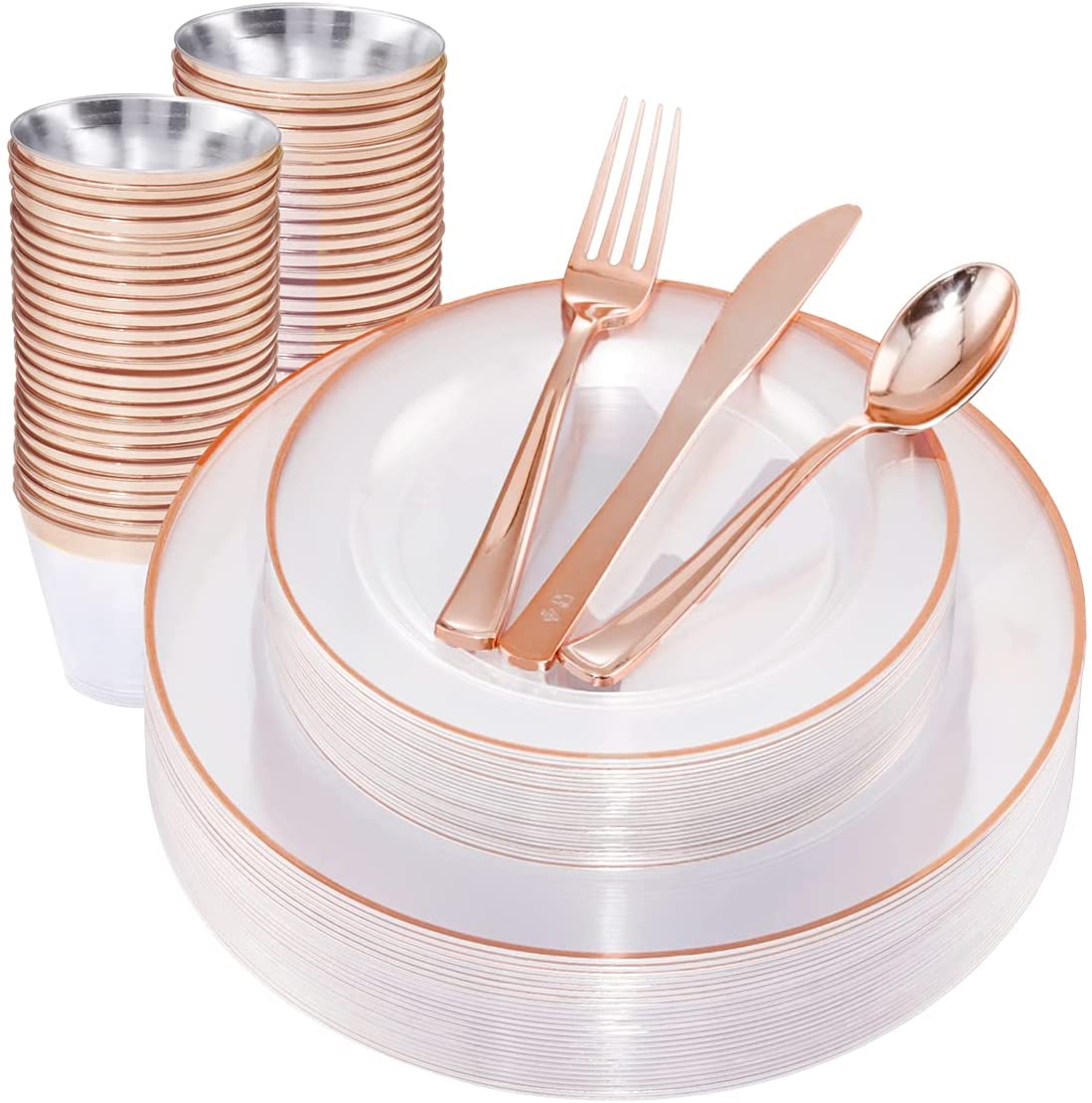 - SIMPLE DESIGN: These clear plastic plates are decorated with the simplest trim of rose gold, together with rose gold silverware and clear rose gold plastic cups. This disposable dinnerware set will turn your dinner and party into an elegant and classy one.