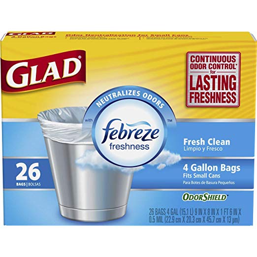 Glad Small Trash Bags – OdorShield 4 Gallon White Trash Bag, Febreze Fresh Clean – 26 Count Each (Pack of 6)