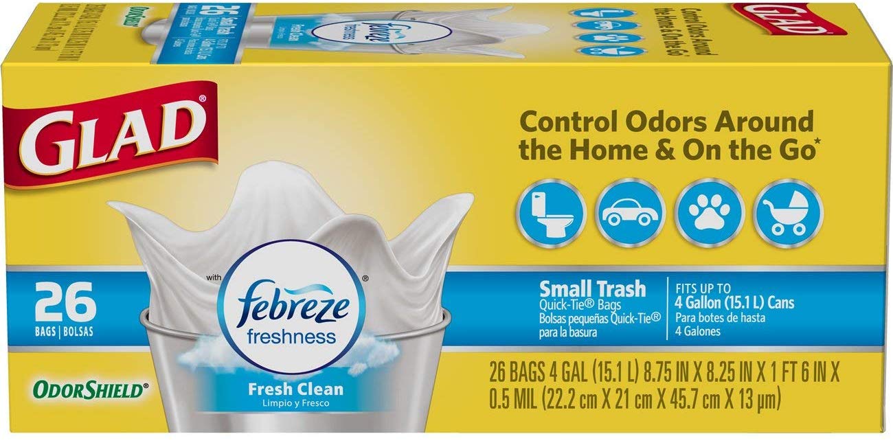 Glad Small Trash Bags – OdorShield 4 Gallon White Trash Bag, Febreze Fresh Clean – 26 Count- Pack of 6 – Link