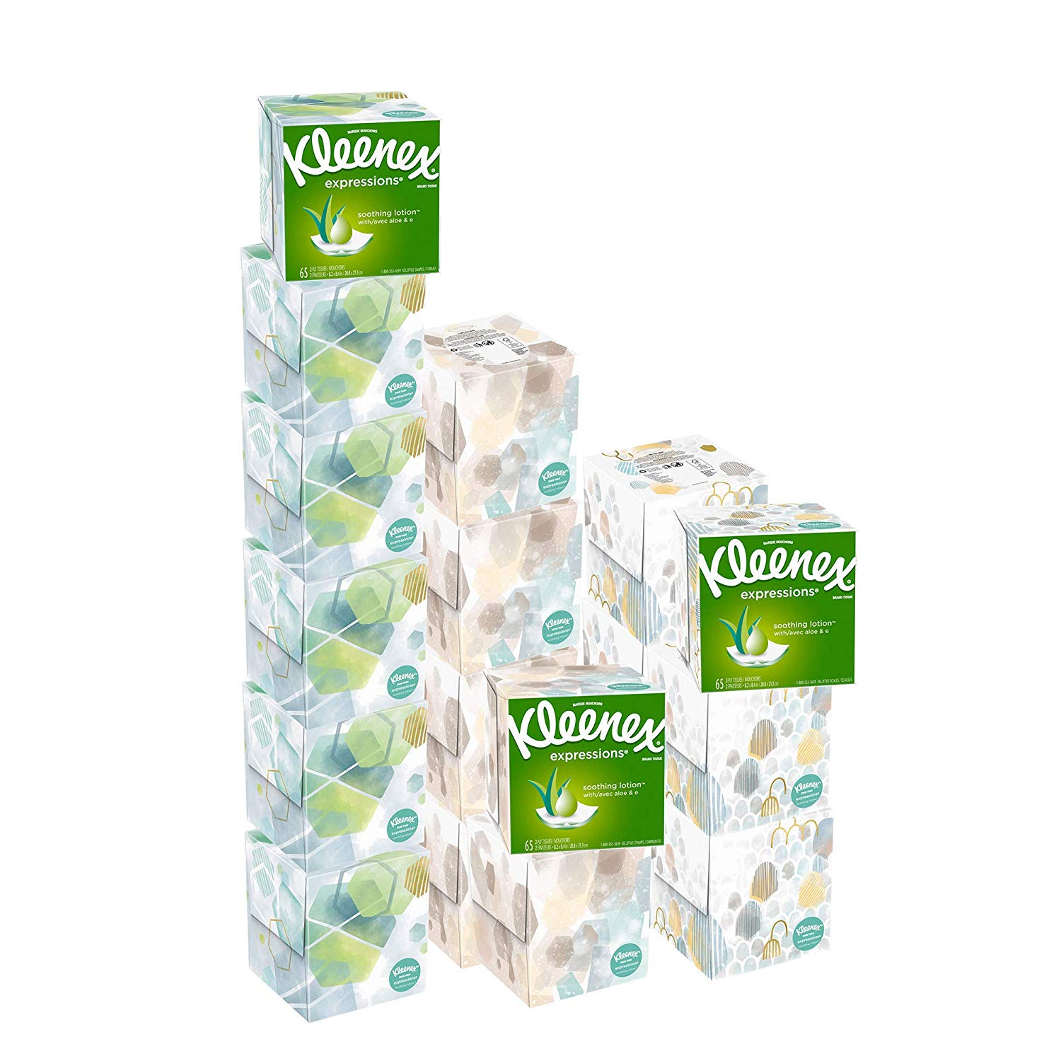 - Contains 18 cube boxes, 65 Kleenex Expressions Soothing Lotion tissues per box (1,170 tissues total)