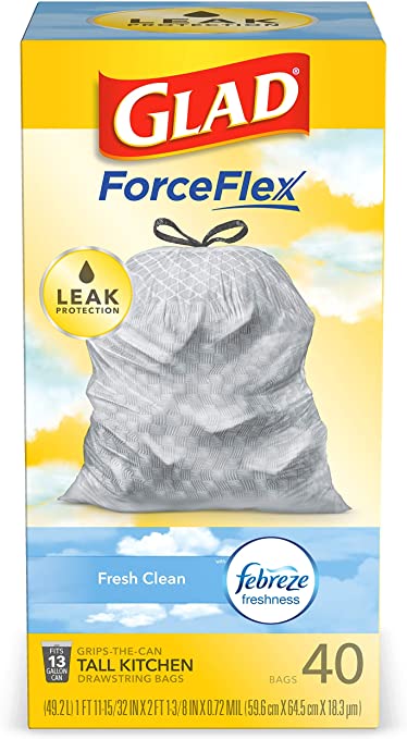 - 13 GALLON GREY PLASTIC TRASH BAGS: Handle daily kitchen and household demands with Glad’s13 gallon tall garbage bag in a Febreze Fresh Clean Scent