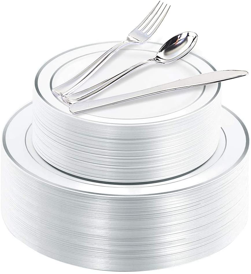 - HEALTHY MATERIAL: 100% food grade, non-toxic, BPA free plastic! And our silver disposable plates with plastic cutlery are durable, really the best choice to have a party!