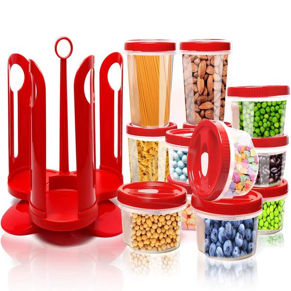 - ★INNOVATIVE RACK ORGANIZATION AND STORAGE: This canister set has a ready to assemble rotating rack for easy storage, save up a bunce of free space, organize your pantry easily. User friendly designed handle allows you to displace them easily from one place to another. The carousel is not only could be used as the storage container clean for dry, but also could be used as baggy rack, extremely practical and easy to use