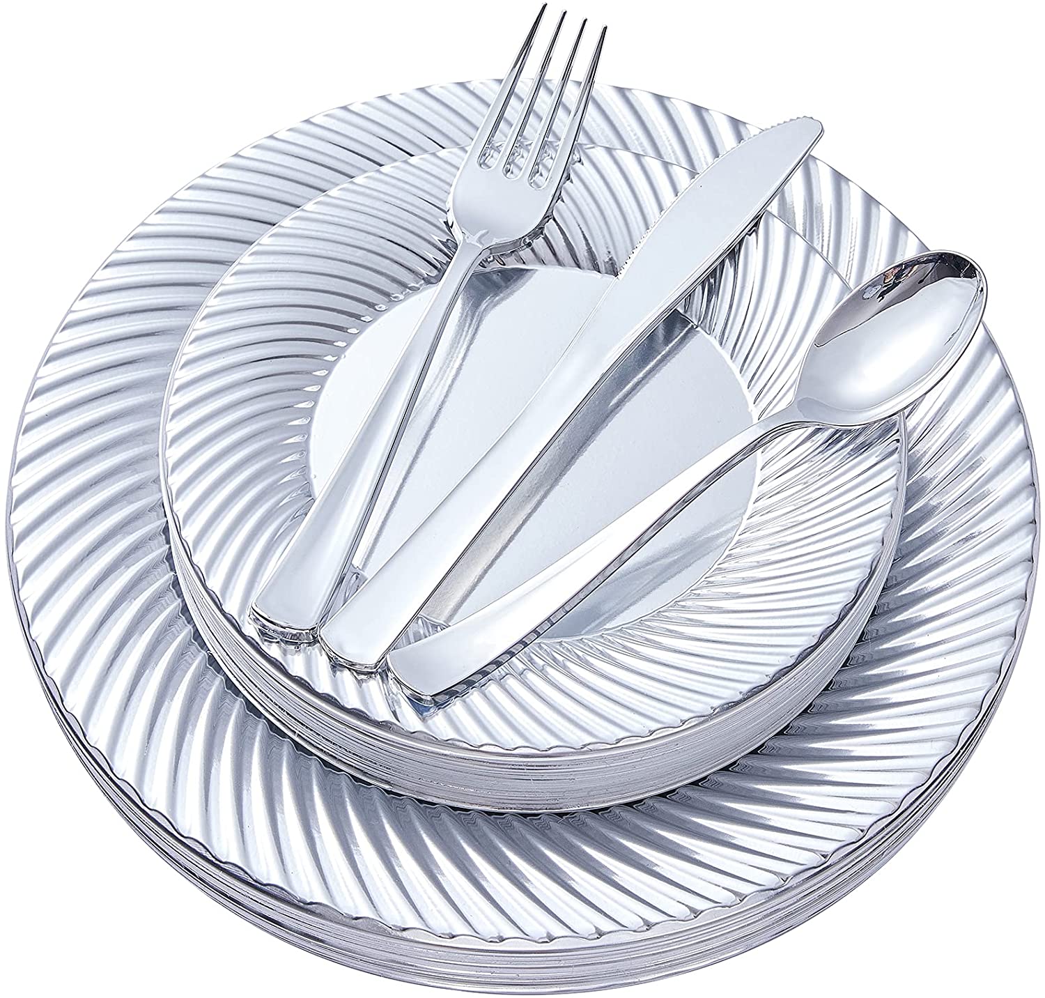 - PERFECT DESIGN: The silver plastic cutlery is designed with a spiral texture on the surface, which looks attractive and elegant. The plastic dinnerware set is beautiful and generous, use this to briten up the party