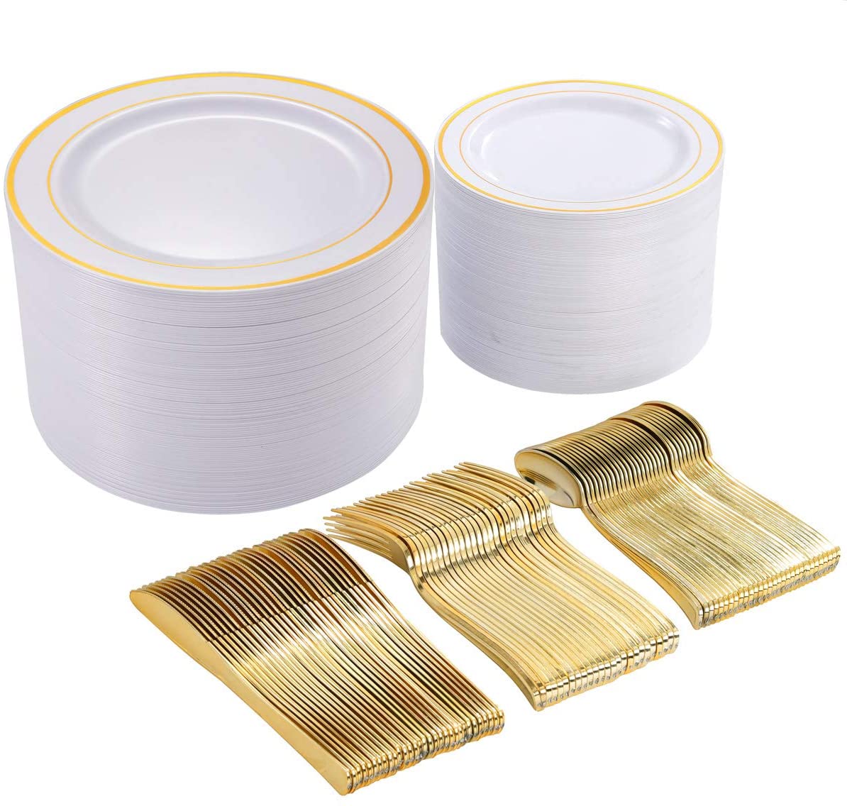 - PERFECT FOR ANY OCCASIONS: This nice gold rimmed plastic plates and flatware makes the perfect addition to you weddings, party, anniversaries, baby showers, bridal showers, banquets, everyday mealtime, picnics, holiday and formal dinners.
