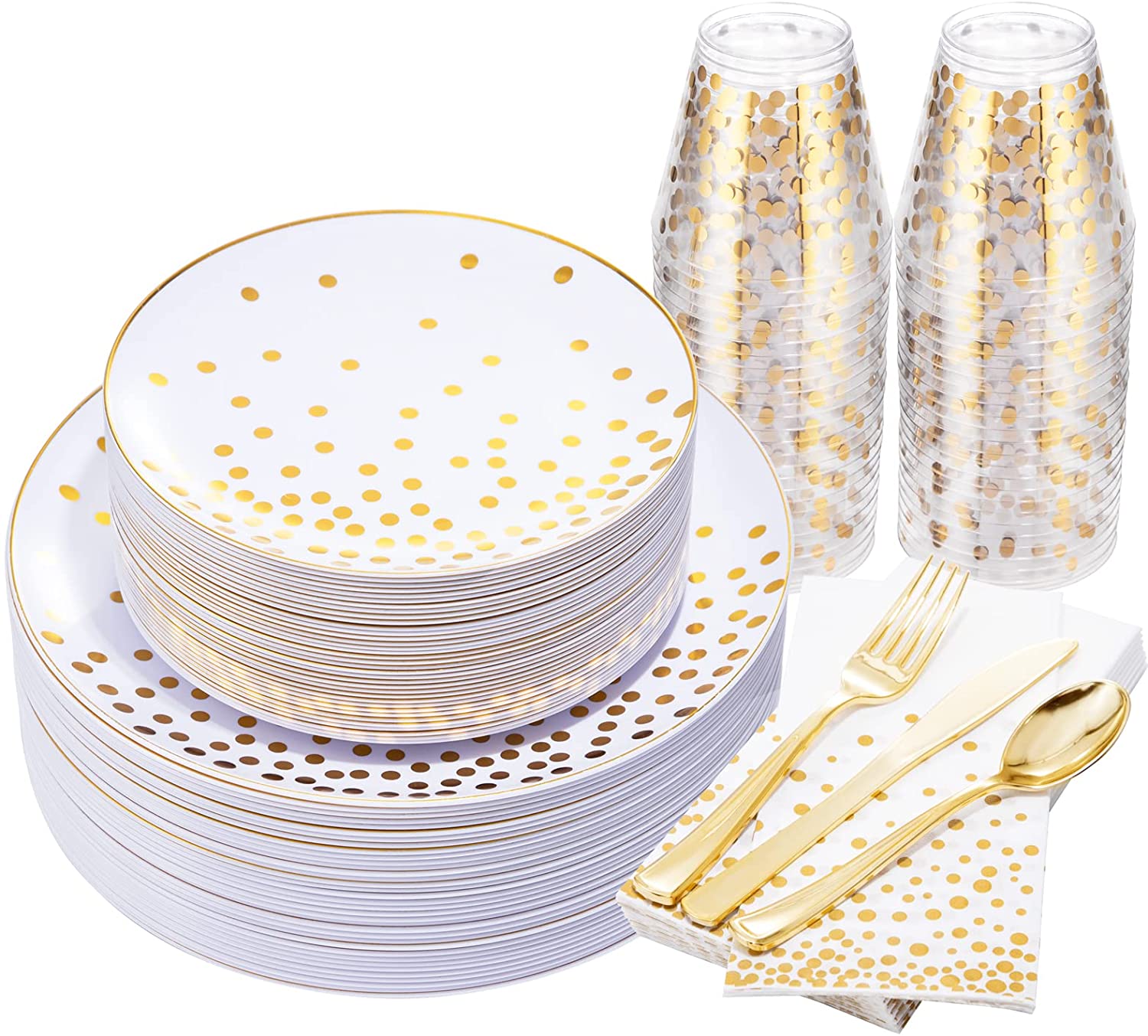 - ⩺【DESIGNED FOR ALL OCCASIONS】: Our gold disposable dinnerware set is ideal for all occasions. Through their embellishment, can make a monotonous table become more fashionable. The gold wedding plates with elegant gold foil dots can suit for your Christmas, Banquet Dinner, Anniversaries, Weddings, Engagements, Holiday and others.
