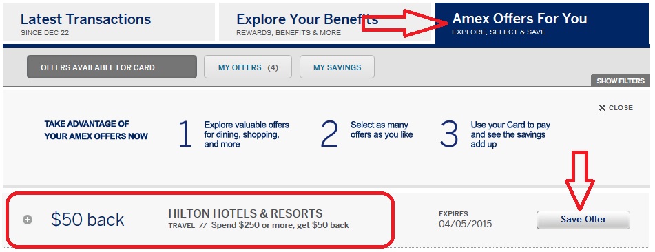 - If available, be sure to save the offer to your card by clicking on “Save Offer”. Note: Before clicking on “Save Offer” be sure to check under all your American Express credit cards. If you have this offer under more than 1 card, first open a new tab in the same browser for each of the cards that this offer is found under. Once you have this offer open on all available accounts, only then hit “Save Offer”. This way you can get this offer more than once, as normally, once you click “Save Offer” on one account, the same offer on the other accounts disappear.