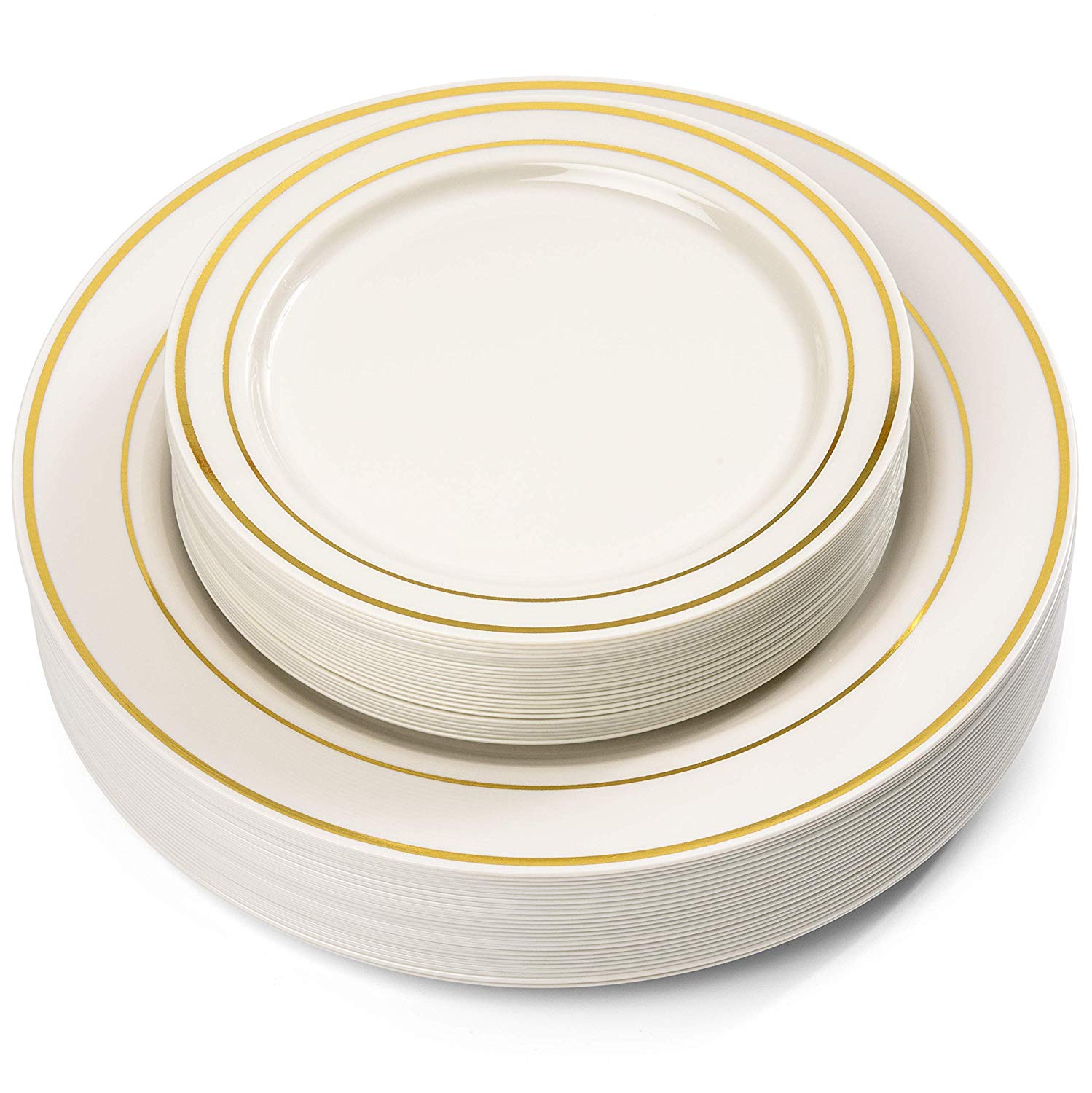 - ELEGANT & STYLISH: These Gold Rimmed Ivory plates are nothing like the cheaply made paper ones you may be used to. They have a slight depth and feature a beautiful and elegantly designed gold rim.