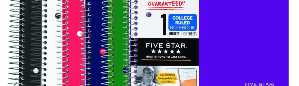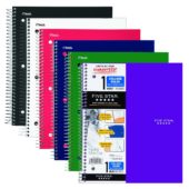 - Six pack of 1 Subject spiral notebooks, each contain 100 college ruled sheets that are ink bleed resistant; 11″x 8 1/2″ sheet size; comes in an assortment of colors: black, red, Navy blue, green, white and purple