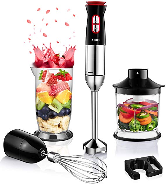 - Buy 1 Get 5 – Aicok 5 in 1 immersion hand blender set includes 700ml Beaker, 500ml Food Chopper, Egg Whisk, Stainless Steel Blending Shaft and Wall Bracket. All attachments are dishwasher safe and BPA-Free