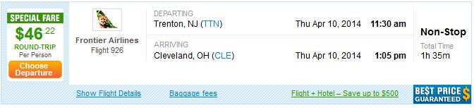 You can currently snag tickets on Frontier Airlines from Trenton NJ – Cleveland Ohio or vice versa for just $22 one way or $46 round trip!