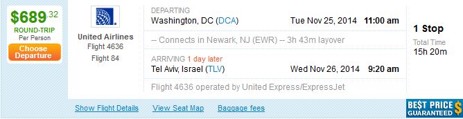 You can currently snag tickets Washington – Tel Aviv for only $690 round trip! Dates that are coming up for this fare, on the outbound are November 25 through December 2, and on the return through December 29.