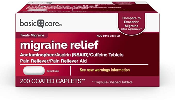 - MIGRAINE PAIN: The pain of migraine headaches can disrupt your lifestyle. Amazon Basic Care Migraine Formula Caplets has three active ingredients to help treat migraine pain.