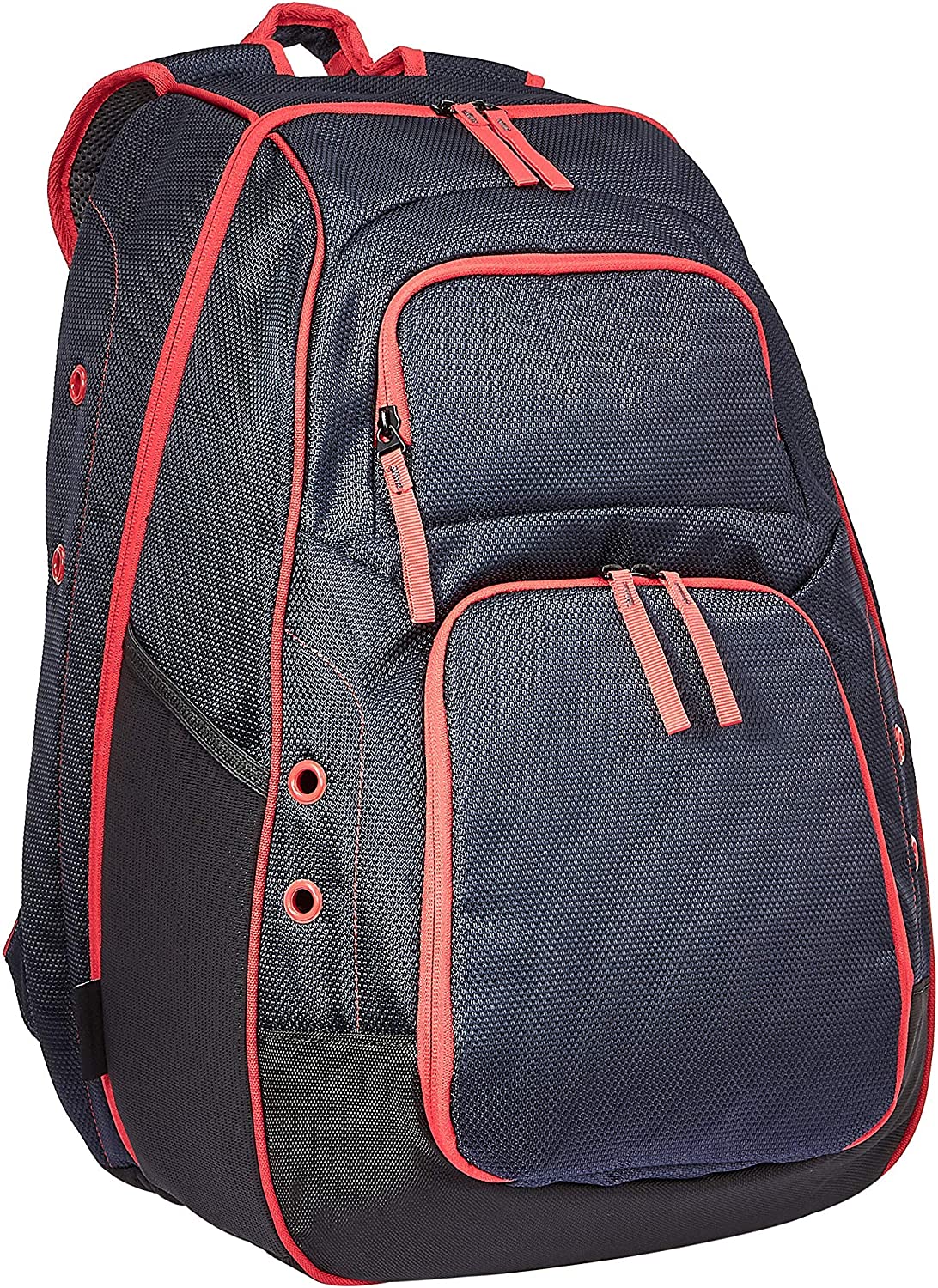 - Front zipper pocket, top pocket, 2 mesh side pockets, main compartment with additional divided pockets for small items, and a front compartment for ball or shoe storage