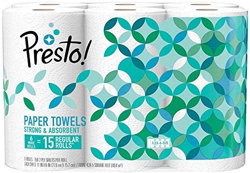 Amazon Brand – Presto! Flex-a-Size Paper Towels, Huge Roll, 6 Count = 15 Regular Rolls – Link