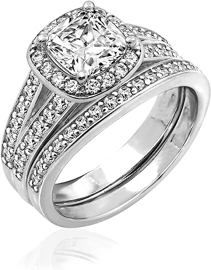 - Cushion halo ring set adorned with round brilliant cut Infinite Elements Cubic Zirconia, each ring features two Zirconia set bands