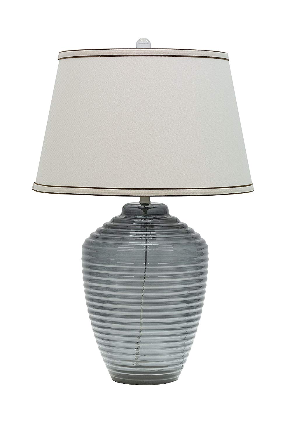 - Smoke Colored finish | Lampshade color & type – Off White with brown trim on top and bottom, Faux Brussel Fabric, Empire shaped lamp shade
