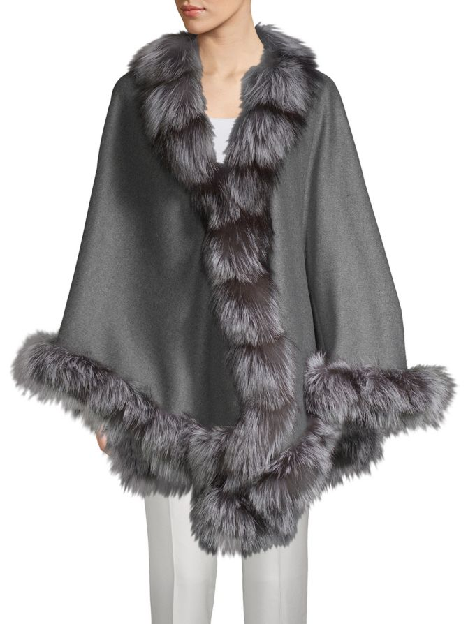 “Stylish wool and cashmere cape with fox fur detailing.”