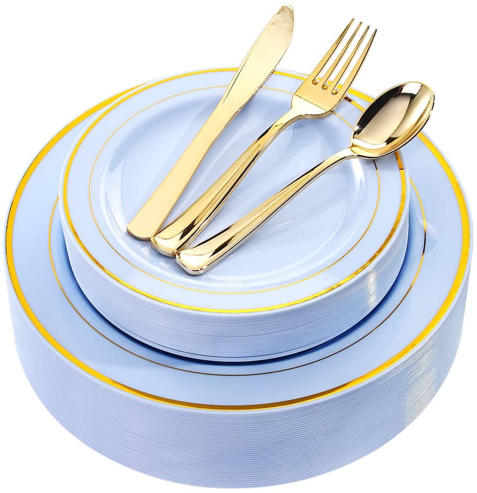 - ELEGANT DESIGN: If you are tired of plain white plates, try our blue plates. The blue plastic plates with gold trim matched the gold cutlery make the dull banquet suddenly full of color. It will definitely impress the guests.