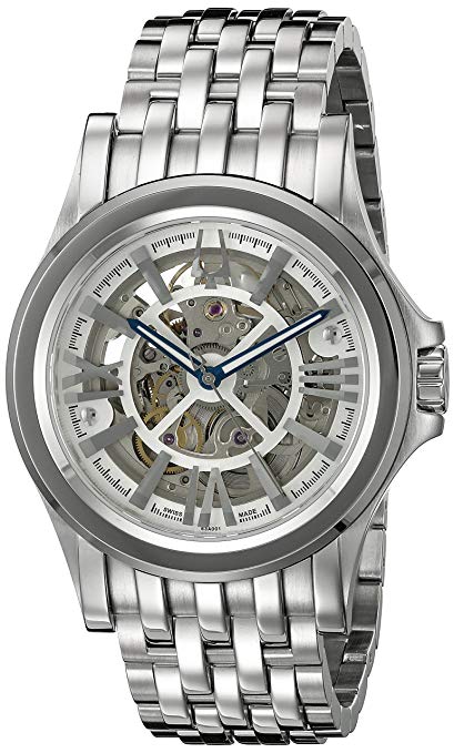 - Silver Skeletonized See-Thru Dial with Silver Tone, White and Blue Hands and Silver Tone Hour Markers and Roman Numerals; Exhibition Case Back; Sapphire Crystal; Stainless Steel Case and Bracelet