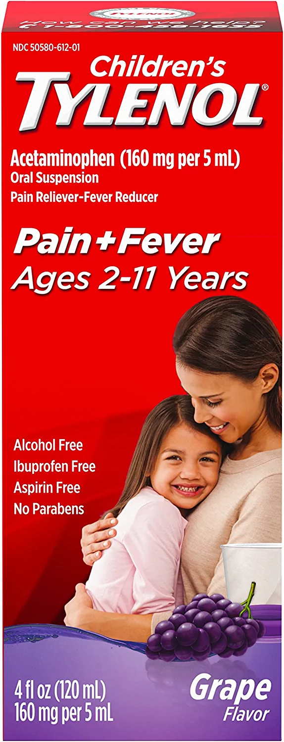 - 4-fluid ounce bottle of Children’s Tylenol Liquid Oral Suspension Pain + Fever Medicine with grape flavor to temporarily relieve cold and flu symptoms, including sore throat, headache and fever