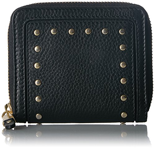 - Polished dome studs lends an edgy aesthetic to a compact zip-around leather wallet perfect for keeping essential cards and cash neatly organized.