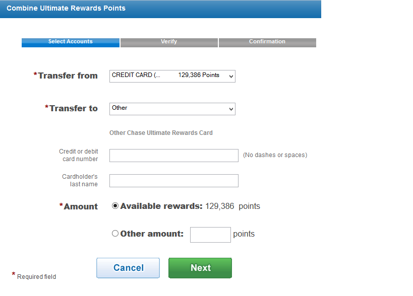 4. On the next screen you will see a transfer from and transfer to option. Select the correct card you want to transfer the points from. If the card is not linked to your account such as a spouse’s account, it will not appear in the “transfer to” drop down menu. What you need to do is select “other” and then type in the credit card number and last name.