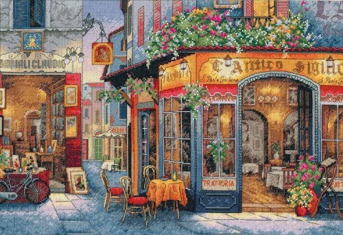- This advanced counted cross stitch pattern features a picturesque café on a colorful street in Europe.