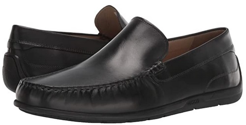 - Slip-on leather loafer featuring moccasin-stitched toe and textured driver’s heel