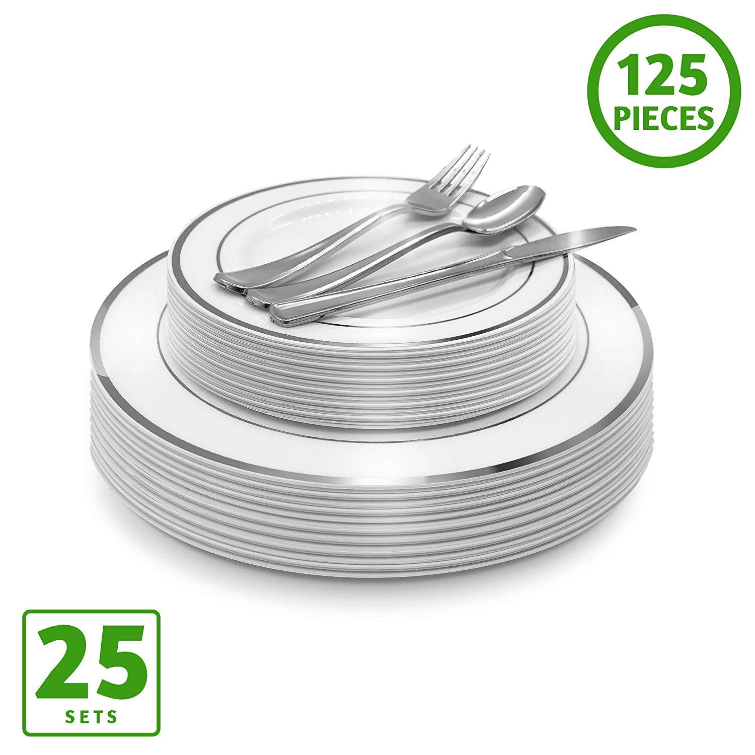 - VALUE PACK – 125 Piece silver dinnerware set includes 25 dinner plates, 25 salad or dessert plates, 25 forks, 25 knives and 25 spoons, perfect for serving 25 guests