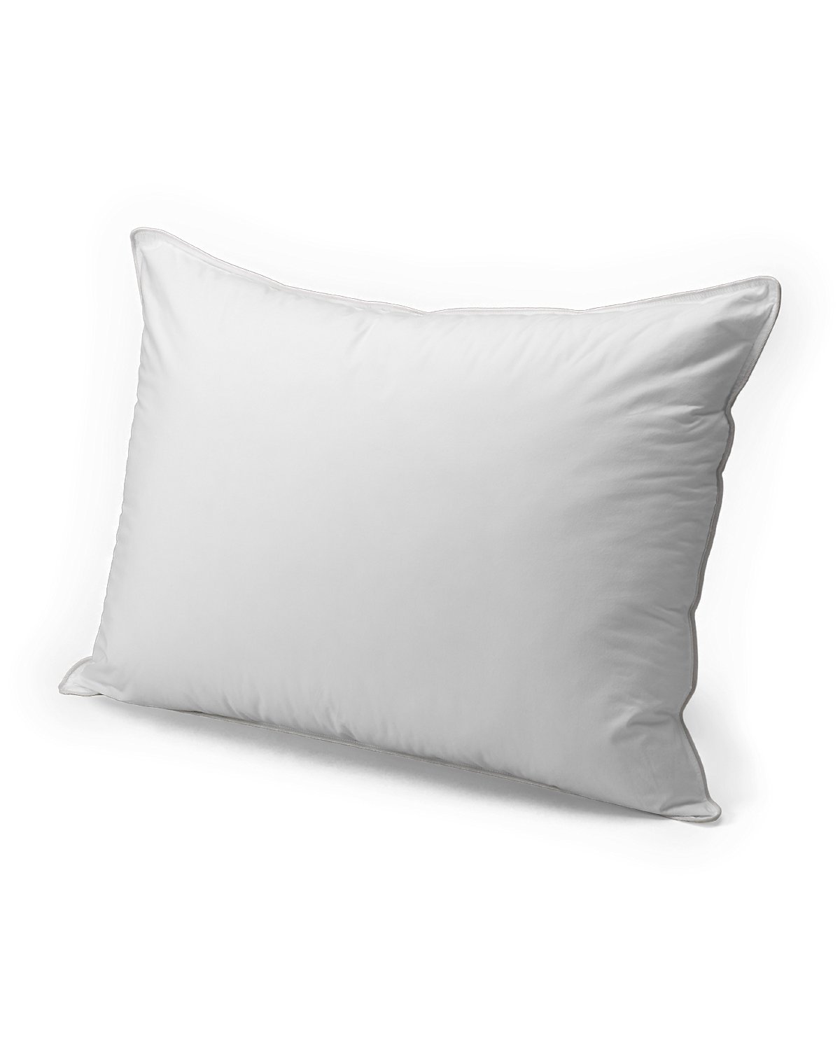 “Dual-chamber construction provides the perfect balance of support and comfort. Inner chamber of polyester fiber/goose down is surrounded by a soft outer chamber of goose down. Includes removable pillow protector of 400-thread count cotton. Available in two sizes and three firmness levels.”