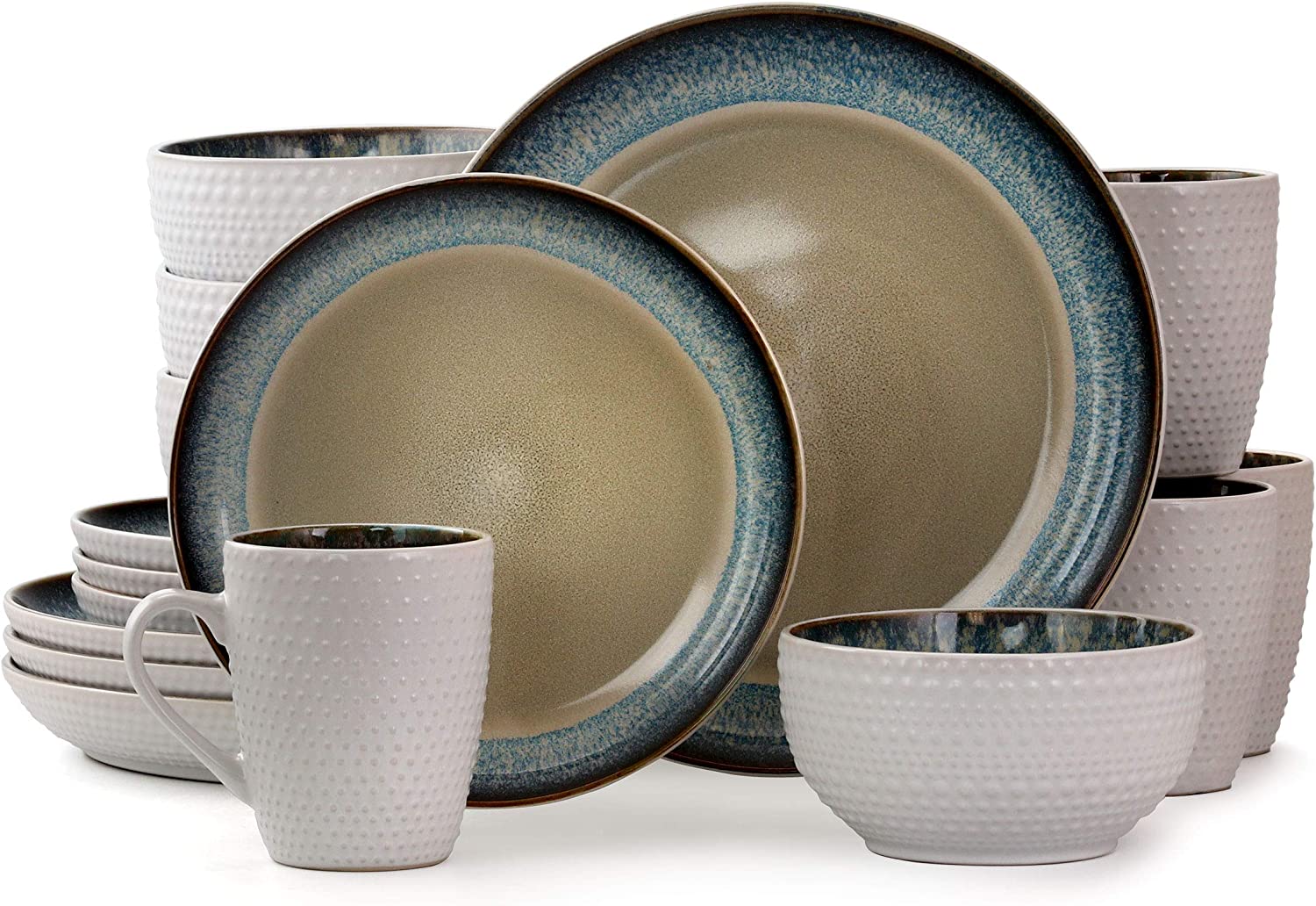 Elama Round Stoneware Contemporary Dinnerware Dish Set, 16 Piece, Warm Taupe with Blue Trim – Link