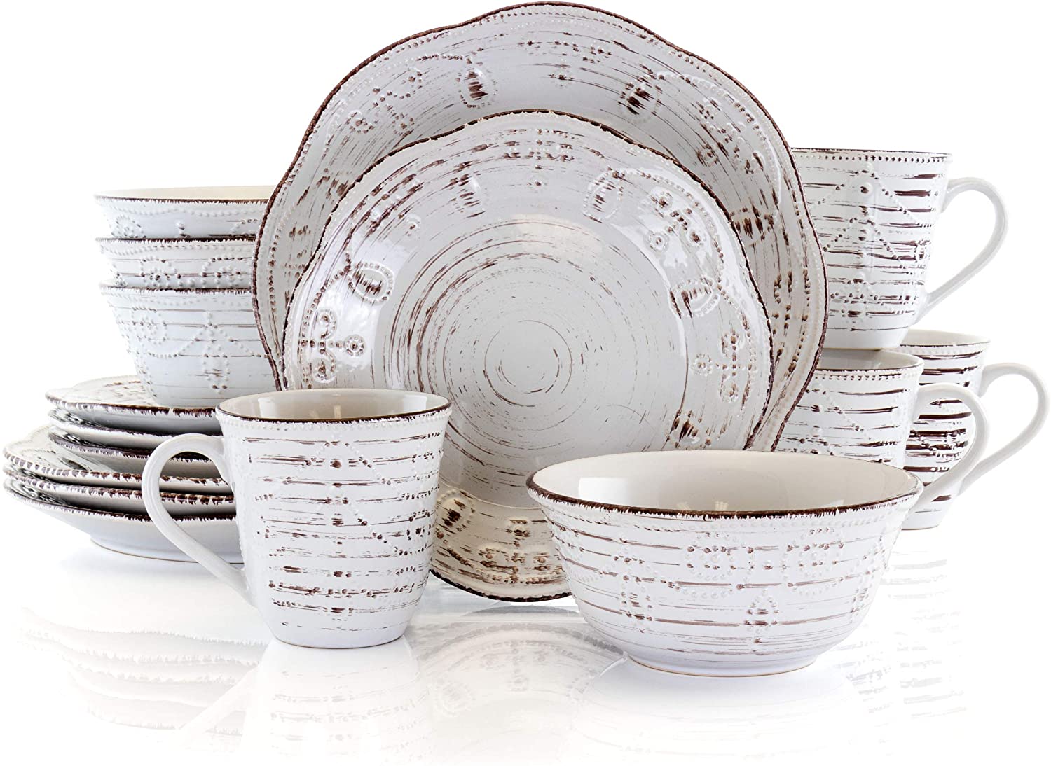 - ◈A STUNNING ACCENT TO YOUR TABLE◈ The Elama Rustic Birch 16 Piece Embossed Scalloped Stoneware Round Dinnerware Set in White with Brown Accents