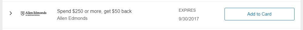 — If you are an American Express cardholder, be sure to check your online americanexpress.com profile under “Amex Offers & Benefits” for a $50 statement credit on $250+ at Allen Edmonds.