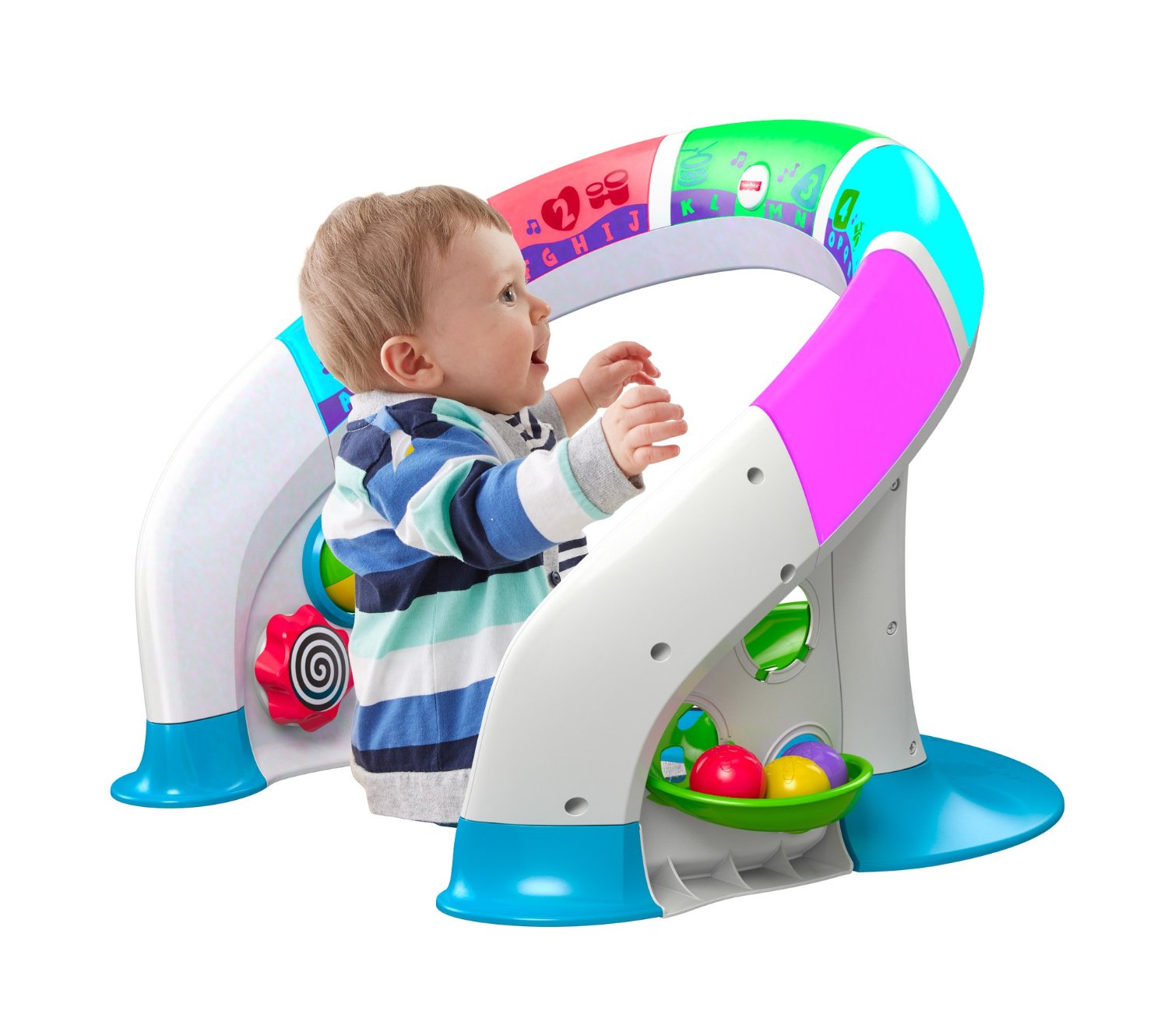 - 3 ways to play as baby grows!Mode 1 – Piano Play Perfect for the sitting baby as baby sits in the middle and touches the bar for piano tones, music & lights!Mode 2 – Dance PartyEncourages baby to get up and move with upbeat music, spoken phrases, sounds & instruments as baby cruises around and touches the barMode 3 – Learning & GamesTeaches baby ABCs, counting, numbers and more as baby looks, cruises and follows the moving lights