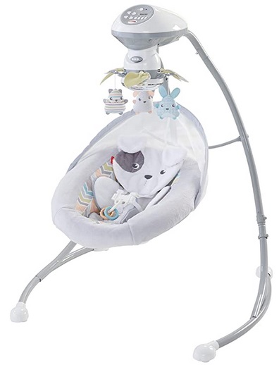 - Dual-motion, puppy-themed baby swing sways side-to-side or head-to-toe