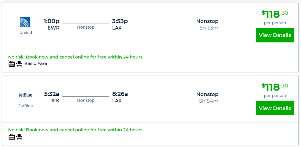 You can currently find flights from NYC (Either EWR or JFK) to Los Angeles (LAX), or vice Versa, from Los Angeles to NYC for $118.30 each way.