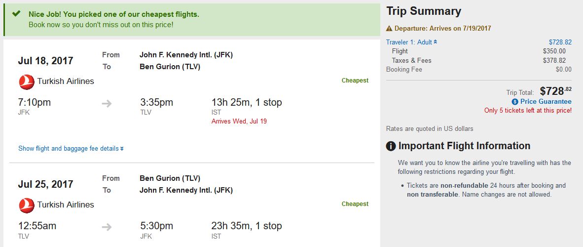 You can currently snag flights, on select dates, during the summer month of July and beginning of August, from New York to Tel Aviv for just $728.71 round-trip! Tickets for children between the ages of 2-12, will be just $641 round-trip!