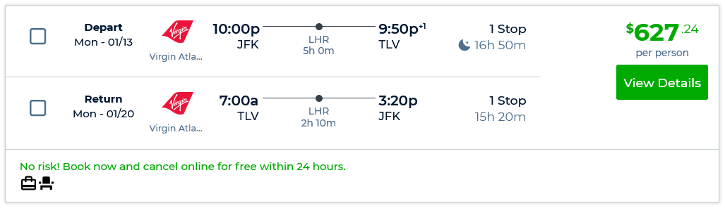 Flights are on Virgin Atlantic, with a stop-over in London.