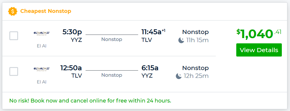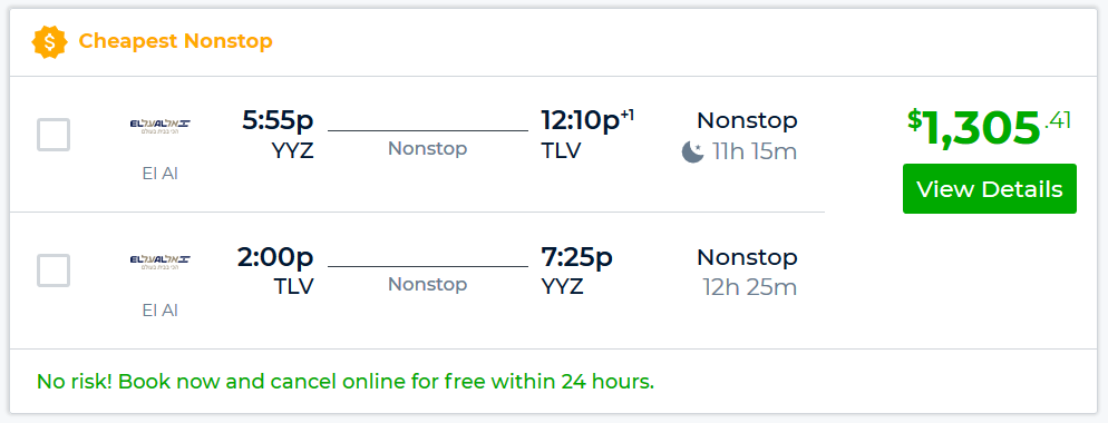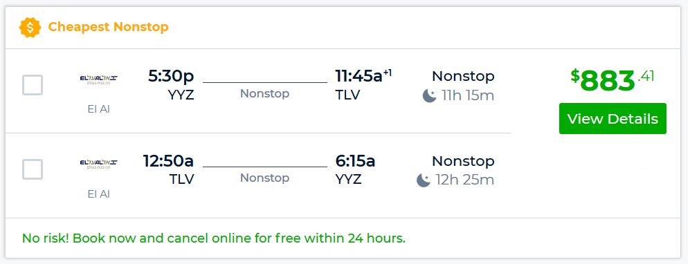 El Al currently has non-stop flights departing from Toronto to Tel Aviv on September 17 and returning October 7, 8, 9 or 10 for $883 round-trip.