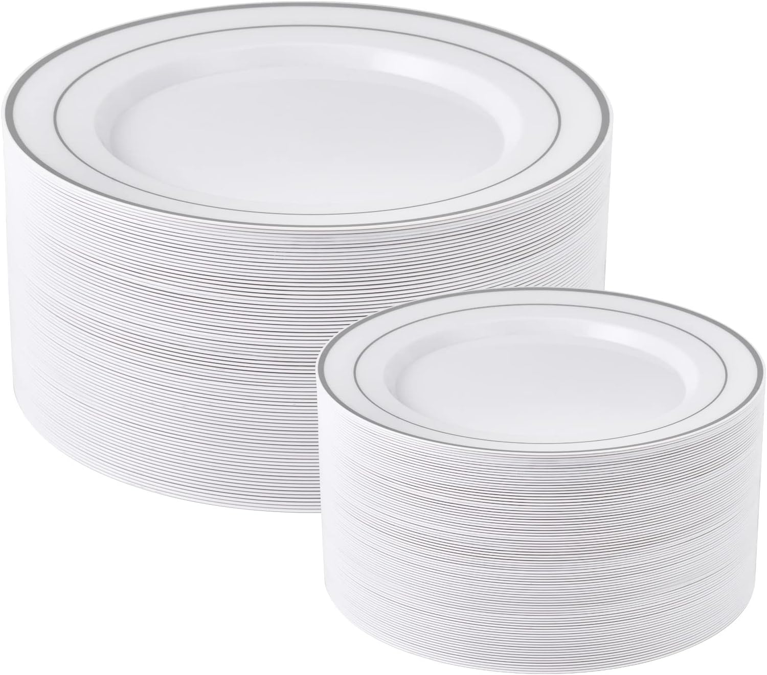 - Plastic plates feature high glossy looks like real China, the classical combination of the sparkling Silver rim on a plain white background brings a touch of grace and elegance to your posh party setup, perfect for formal and fancy dress parties, even outdoor weddings or birthday parties.