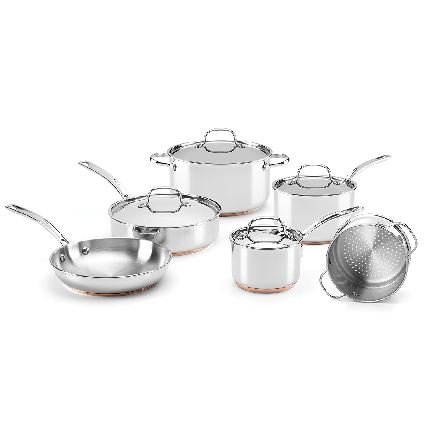 - Set includes 1.5 quart saucepan with lid, 3 quart saucepan with lid, 3 quart steamer insert, 6 quart stockpot with lid, 3 quart sauté pan with lid and a 10″ skillet
