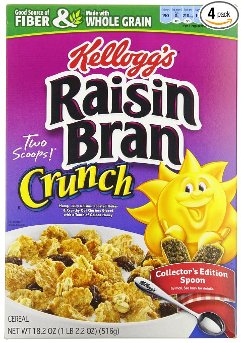- One pack of four, 18.2-ounce boxes of Kellogg’s Raisin Bran Crunch whole wheat and bran cereal