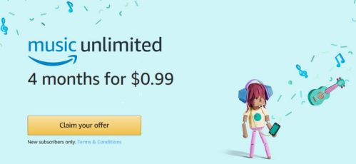 - Promotional offer of 4 months for $0.99, redeemable toward an Amazon Music Unlimited Individual Monthly Plan, is valid from 12:01am (PT) June 29, 2017 through 11:59pm (PT) July 11, 2017.